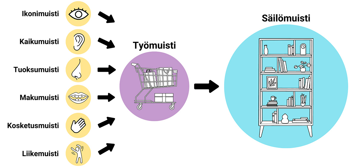 Kuva: Aistiärsyke siirtyy aistielimestä työmuistin avulla säilömuistiin. Säilömuistissa on tunnelmia, tietoa ja taitoja, joihin voi palata muistelutyön avulla (Mikko Apell/Kehitysvammatuki 57 ry).